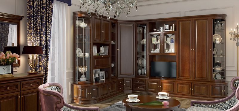 Дополнить классический интерьер гостиной и удачно обустроить угловое пространство, чтобы оно не оставалось пустующим, помогут угловые витрины из коллекции мебели для гостиной «Сильвия» от фабрики «Свобода», г. Рыбинск, созданной в соответствии с требованиями высокого качества, неповторимого стиля и продуманной функциональности.