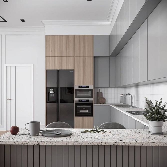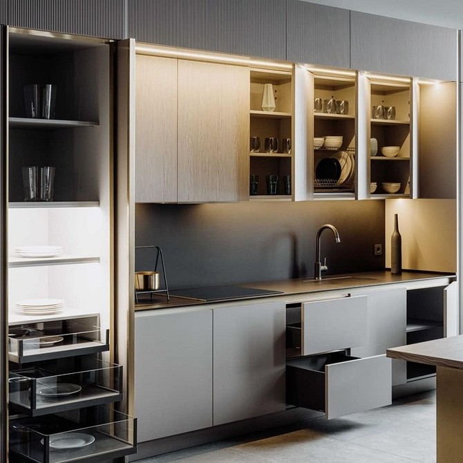 Вечная база всех современных стилей. В реальных квартирах кухни обрастают большим количеством предметов и оказываются в вечном беспорядке. Поэтому наше всё — закрытые места хранения.