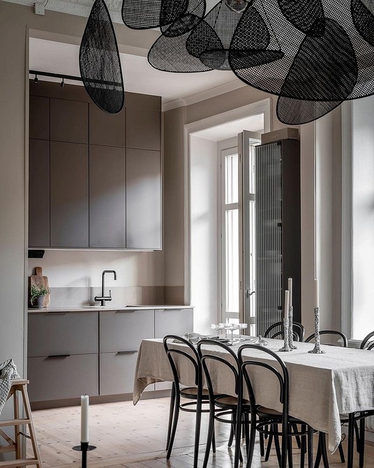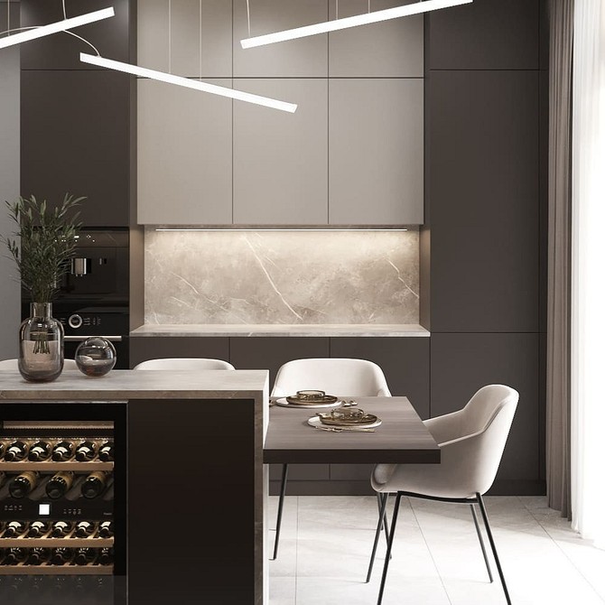 Как и любая стильная современная кухня требует тотальной встроенности всей техники и мебели — не должно быть тёмных углов, верхних шкафов не до потолка, отдельностоящих плит и микроволновок.