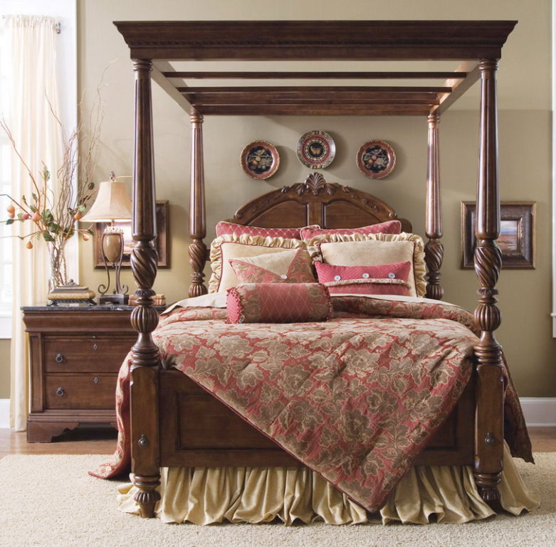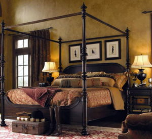 У англичан принято приобретать мебельные изделия на заказ. Кровать следует подобрать массивную, на высоких ножках. Изголовье может быть резным или прямоугольным.