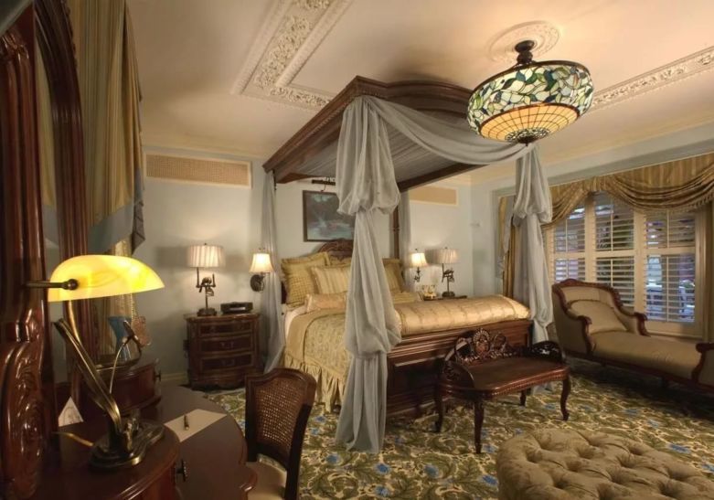 В спальне, обустроенной в викторианском дизайне, чаще всего можно встретить ковёр с геометрическими или цветочно-растительными узорами. Он может располагаться в середине помещения либо возле банкетки.