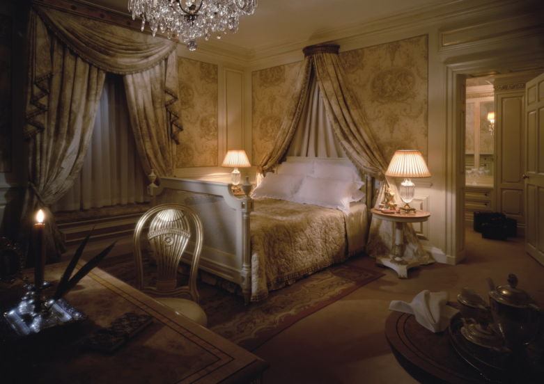 В центральной части потолочной конструкции предпочтительно установить люстру. По обеим сторонам кровати можно поставить светильники, стилизованные под канделябры, а на прикроватных тумбочках расположить настольные лампы. В зону отдыха дизайнеры советуют приобрести напольные светильники с тканевыми абажурами.
