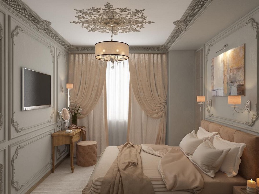 Ненавязчивый бело-золотой или кремово-бежевый оттенки в маленькой спальне в классическом стиле будут выглядеть намного легче, чем темные. К тому же, на фоне нежной отделки любые вкрапления коричневого, черного и других насыщенных цветов привлекут к себе много внимания, создавая ненужный контраст и зрительно уменьшая пространство.
