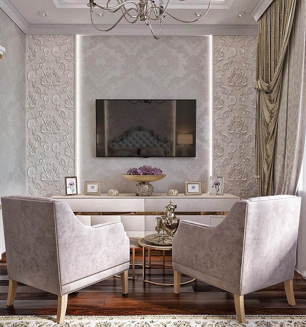 Органично вписать современную технику в старинный интерьер — непростая задача. Можно спрятать ТВ в одной из секций шкафа-купе. Либо наоборот, подчеркнуть лепниной в виде рамки, акцентируя внимание. Еще вариант — сделать в процессе ремонта нишу из гипсокартона и установить под телевизором каминный портал, украсив эту часть стены декоративными пилястрами или колоннами.