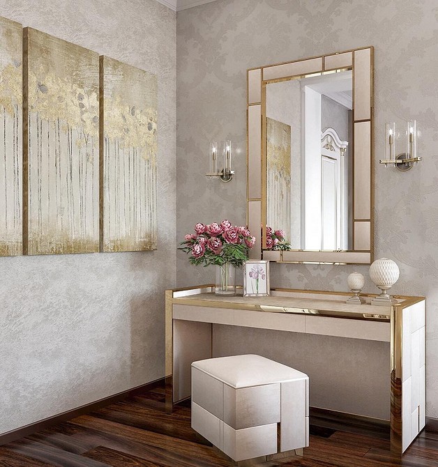 Зона красоты представлена туалетным столиком и банкеткой. В маленьких комнатах столик может быть встроен в шкаф или представлять собой консоль на элегантных ножках. К нему прилагаются зеркало и дополнительное освещение.