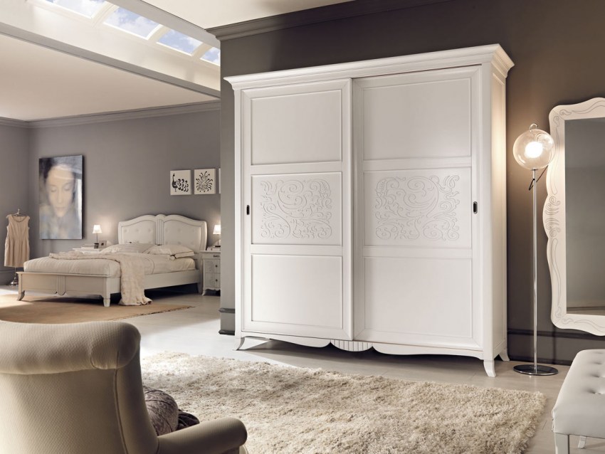 Самый подходящий вид мебели для спальни в классическом стиле — распашной шкаф. Его фасады повторяют основной рисунок выбранного дизайна, а зеркальные вставки добавляют интерьеру роскоши. Изящный комод, несмотря на небольшие размеры, вмещает большое количество вещей.