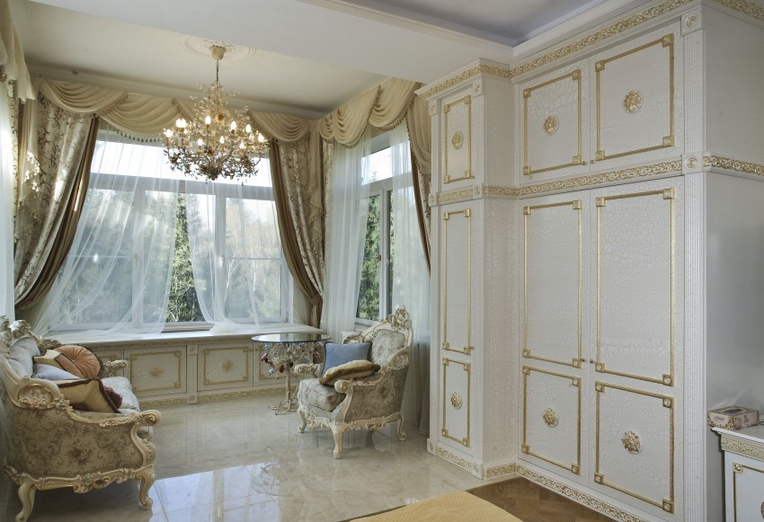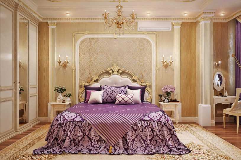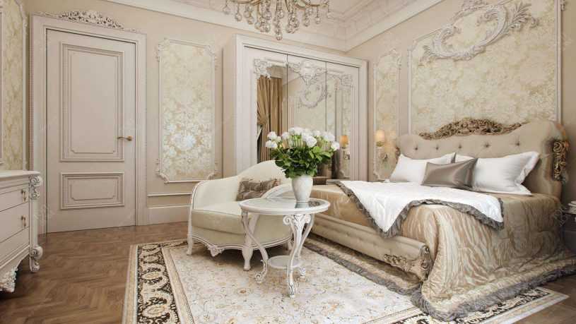 С помощью богатой лепнины, декоративного панно позади кровати, а также типичной для классики хрустальной люстры воссоздается соответствующий интерьер. Красивые обои, зеркала, мебель с выгнутыми ножками, а также лампы и подсвечник завершают характерный образ.