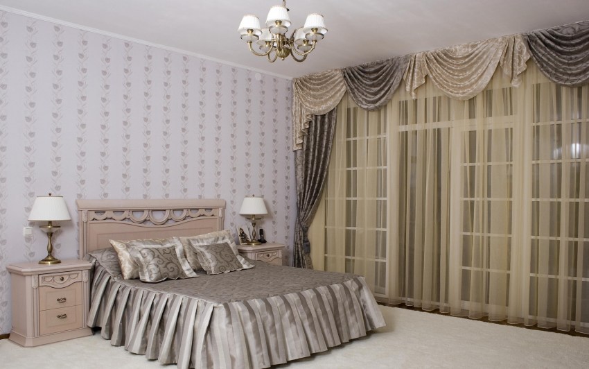 Для штор в классическую спальню подойдут тяжёлые, богатые материалы. Например, бархатные, атласные, парчовые или шёлковые ткани. Великолепно дополнит картину декор в виде бахромы, тесьмы, подхватов или рюшей. Уместно будет использование ламбрекенов.