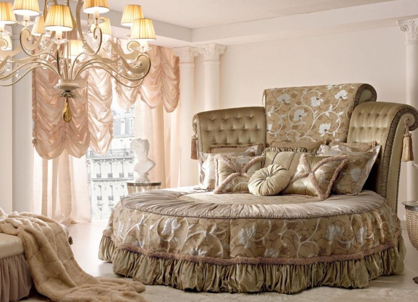 Главный акцент – это кровать. Она обязана быть тяжёлой, большой, представительной и удобной. Прекрасной дополняющей деталью будет балдахин. Он добавит помещению комфорта. Но его можно использовать лишь в спальнях большой площади с высокими потолками.
