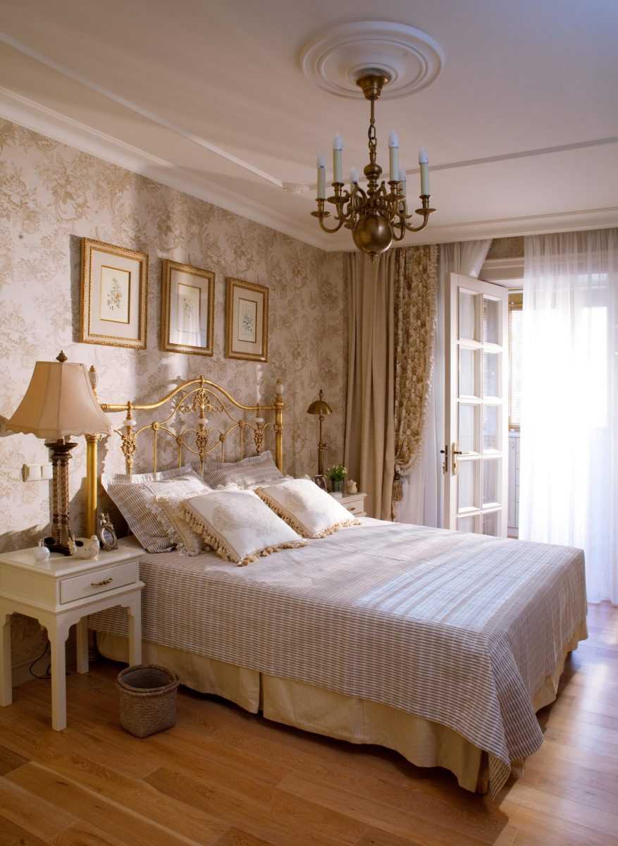 В качестве главного освещение спальни, на потолке можно расположить массивную люстру, украшенную хрустальными подвесками и декоративными цепочками. На прикроватных столиках отлично будут смотреться ночники для чтения перед сном, в уютной зоне с креслом можно установить торшер, для стен идеально подойдут бра с металлическими искусственно состаренными деталями.