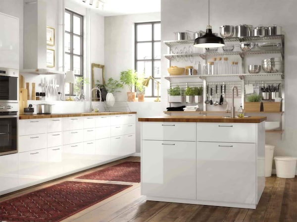 Создать кухню по индивидуальному проекту можно в магазине с помощью специальной программы. В старых домах, где кухню нередко объединяют с гостиной, необходимо разграничить зоны. Для этого можно воспользоваться островом, барной стойкой либо крупным длинным столом. Кроме того, нередко в кухонной зоне пол покрывают плиткой, а гостиную отделывают паркетом либо ламинатом.