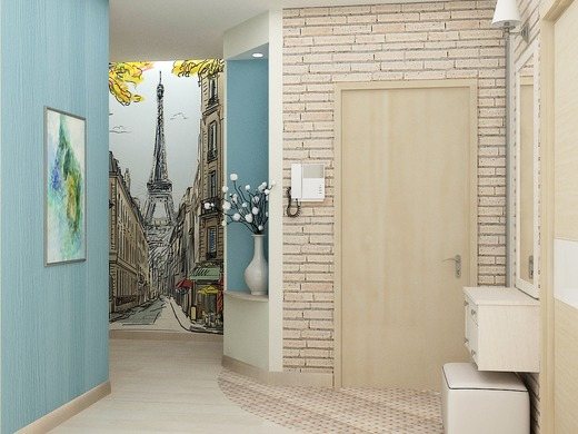 Достаточно дополнить интерьер тематической мебелью, которая, к слову, может быть выполнена самостоятельно, и дизайн превратится в романтичный и нежный. Отдельно стоит поговорить о текстиле для прихожей. Он должен быть обязательно. Если имеется окно, то оформляется оно легкими шторками нежно-бирюзового цвета в мелкий цветочек и с множеством оборок. Если же оконного проема нет, как в большинстве прихожих, то стоит обратить внимание на мебель с обивкой, которая обладает цветочным принтом или на легкие салфетки, которые можно разместить на комоде или туалетном столике.