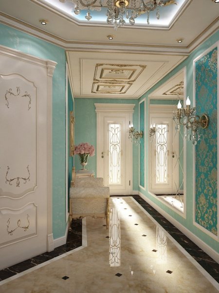 В прихожей бирюза может стать базовым тоном для стен, которые подчеркиваются вертикальными белыми полосами или колоннами, если речь идет о загородном доме. В качестве декора используют большие зеркала в массивных рамах, лепнину, резную мебель, живописные плафоны светильников и люстр, канделябры со свечами.