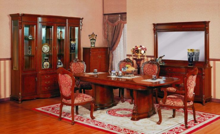 Разные оттенки в классике реализуются преимущественно в текстиле. Плотные темно-бордовые занавески, скатерть на столе с соответствующими узорами, ковер с орнаментом этого цвета. Эти детали хорошо подчеркнут классический стиль в интерьере.