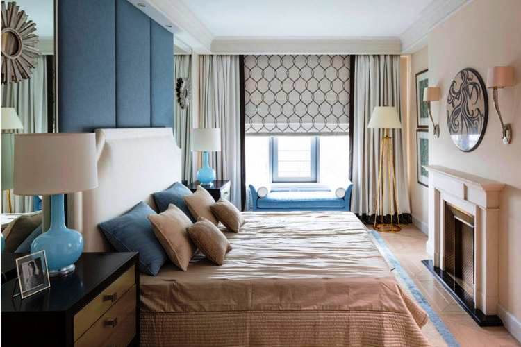 Оформление окон — отдельный важный пункт, поскольку в этой комнате мы спим и важно создать нужный уровень затемнения. Если окна выходят на юг, выбирайте портьеры из плотной ткани, можно более темных тонов. Дополнительную защиту от солнца дадут рулонные блэкаут-шторы — их можно использовать самостоятельно или в комплекте с классическими тканевыми шторами. Если света в комнате наоборот недостаточно, окна нужно максимально открыть: подойдут светлые занавески из легкой полупрозрачной ткани или римские шторы (их также часто используют на кухне).