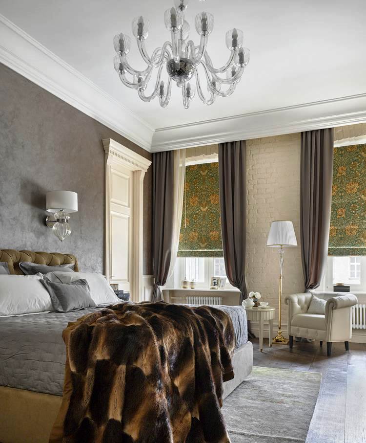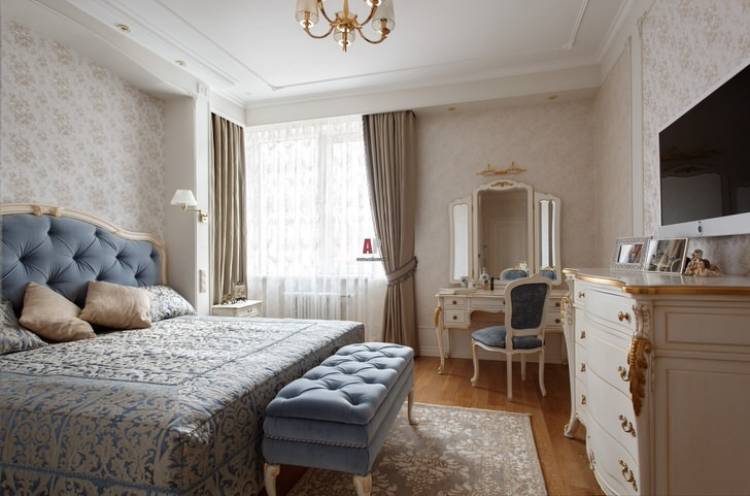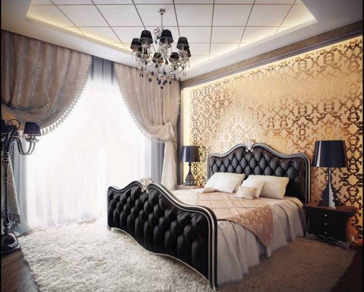 Спальня в стиле неоклассика придется по вкусу любителям элегантной роскоши. Направление подразумевает использование дорогих материалов (кожи, мрамора, гранита, натурального дерева). Характерными чертами стиля являются арки, колонны, бордюры, лепнина и четкие линии. В качестве потолочного и стенового покрытия выбираются материалы спокойных тонов. Оптимальный вариант для спален с высокими потолками.