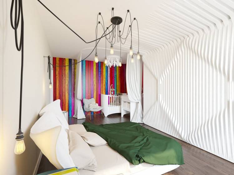 Стены лучше делать однотонными и светлыми. Базовые материалы: краска и обои. Выбирайте экологичные покрытия, например, в комнате сна удачно сыграют даже бумажные полотна. Если хочется сакцентировать внимание на поверхности — как правило, это участок или вся стена за изголовьем — можно использовать следующие приемы.