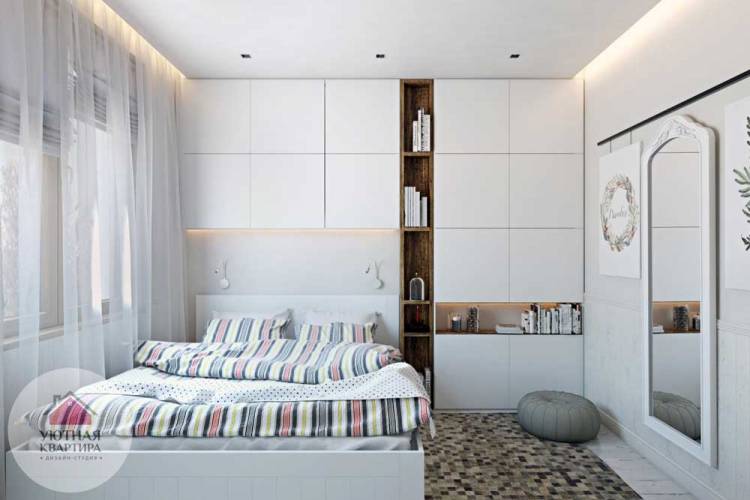 Кровать можно оснастить механизмом, позволяющим задвигать ее в стену или шкаф. Если выбор сделан в пользу классической модели, можно поэкспериментировать с изголовьем, обтянув его кожей или добавив металлические детали.