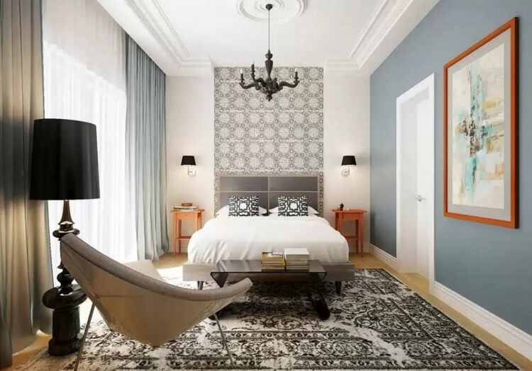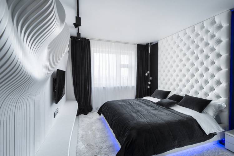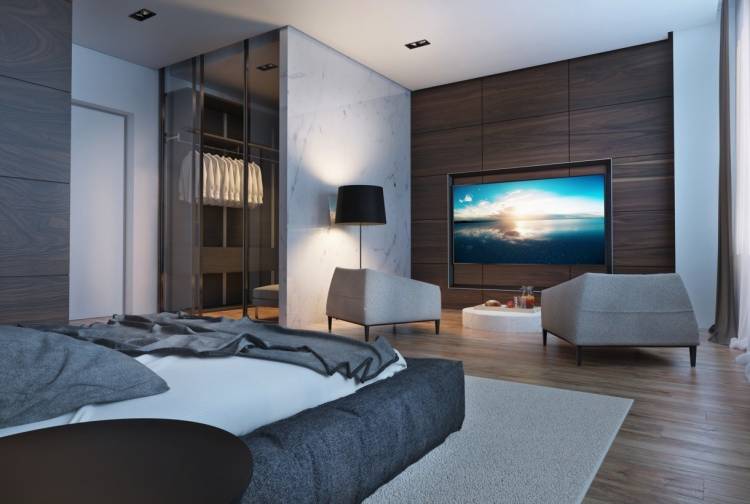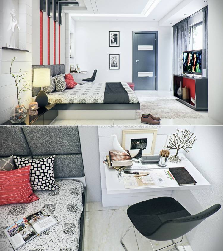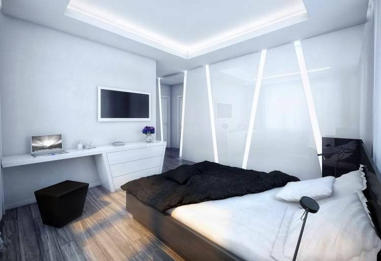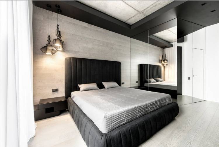 При большой загруженности в повседневной жизни, место отдыха должно максимально способствовать расслаблению и отдыху. В этом случае спальня в стиле минимализм является лучшим вариантом. Минимальное количество функциональной мебели, серо-черные цвета с ярким акцентом не загружают пространство и делают его комфортным.