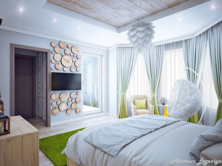 Комната в эко стиле отличается естественной цветовой гаммой и натуральными материалами. Спальня получится светлой, просторной и мягкой. Природные материалы подарят ощущение спокойствия, способствуя максимальному отдыху. Отличный вариант для тех семей, которые разделяют спальню с детьми.