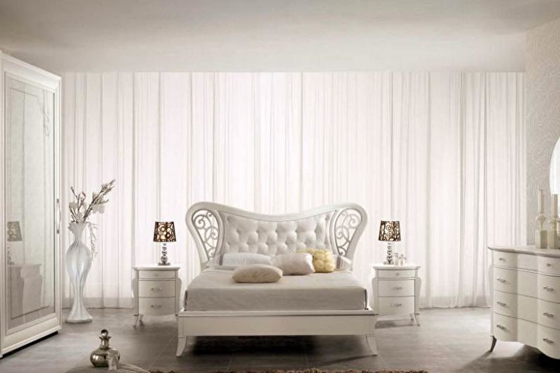 Поскольку обставлять нам предстоит спальню, то не удивительно, что ключевым предметом обстановки станет кровать. Здесь она, как и все остальное, должна быть роскошной, с необычным вычурным изголовьем. Форма ложа в спальне может быть классически прямоугольной или модерново овальной. Изголовье нужно декорировать дорогими тканями, обив его либо бархатом, либо плюшем, либо затянув в кожу. Можно выделить зону изголовья, покрыв стену за ним рельефными обоями или скрыв её за тканевой драпировкой.