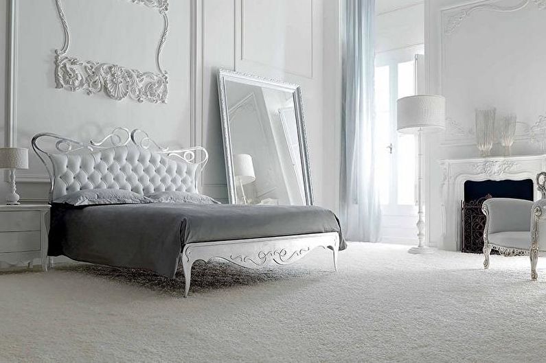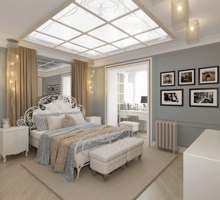 Визуально поднять невысокие потолки в спальне позволят зеркальные панели. Они монтируются фрагментарно или полосами. На каждом уровне присутствуют позолоченные или посеребренные орнаменты. Для спален с высокими потолками используются массивные узоры из лепнины, создающие уют. Из гипсокартонных конструкций сооружаются балки, украшаемые лепниной, из которых составляется кессонный потолок.