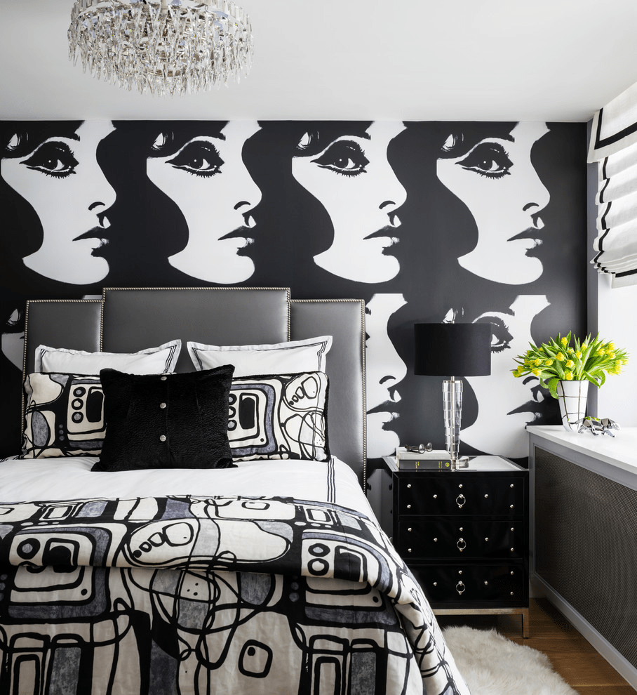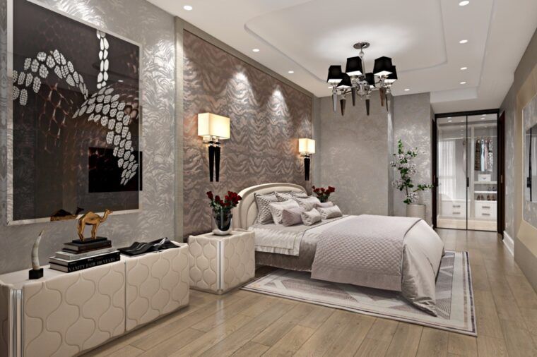 Стены спальни в арте деко являются завершенными картинами, поэтому к их отделке важно подойти ответственно. В качестве решений используется: