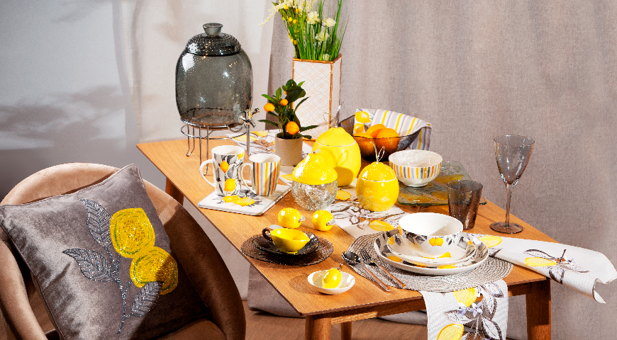 Среди цветов весны 2021 есть два оттенка жёлтого – солнечно-жёлтый и оранжево-жёлтый (оттенок ещё называют «бархатцы»). Роль солнечно-жёлтого оттенка, например, прекрасно исполняет цитрусовый. И, если с Новым годом ассоциируются мандарины, весна – это лимоны, сезон сбора которых как раз приходится в южных странах на апрель. Эти цитрусовые в блюдах и напитках всегда отвечают за свежесть, они освежат и сервировку. Совсем не обязательно покупать много жёлтой посуды, достаточно приобрести несколько предметов для оживления весеннего стола.