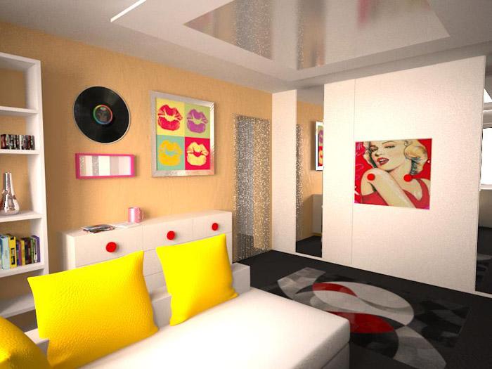 Поп-арт отличается особой яркостью и мультицветностью. Большое значение в таких интерьерах уделяется фотографиям и постерам знаменитостей. Часто используется глянец, яркие цвета, повторяющиеся мотивы орнаментов и рисунков.