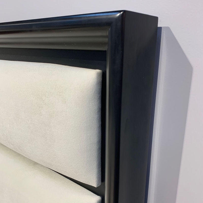 Модель имеет интересное дизайнерское решение изголовья, которое состоит из двух элементов одинаковой конфигурации, но разных размеров. В декоре использована стежка капитоне с пуговицами одного цвета с велюром.