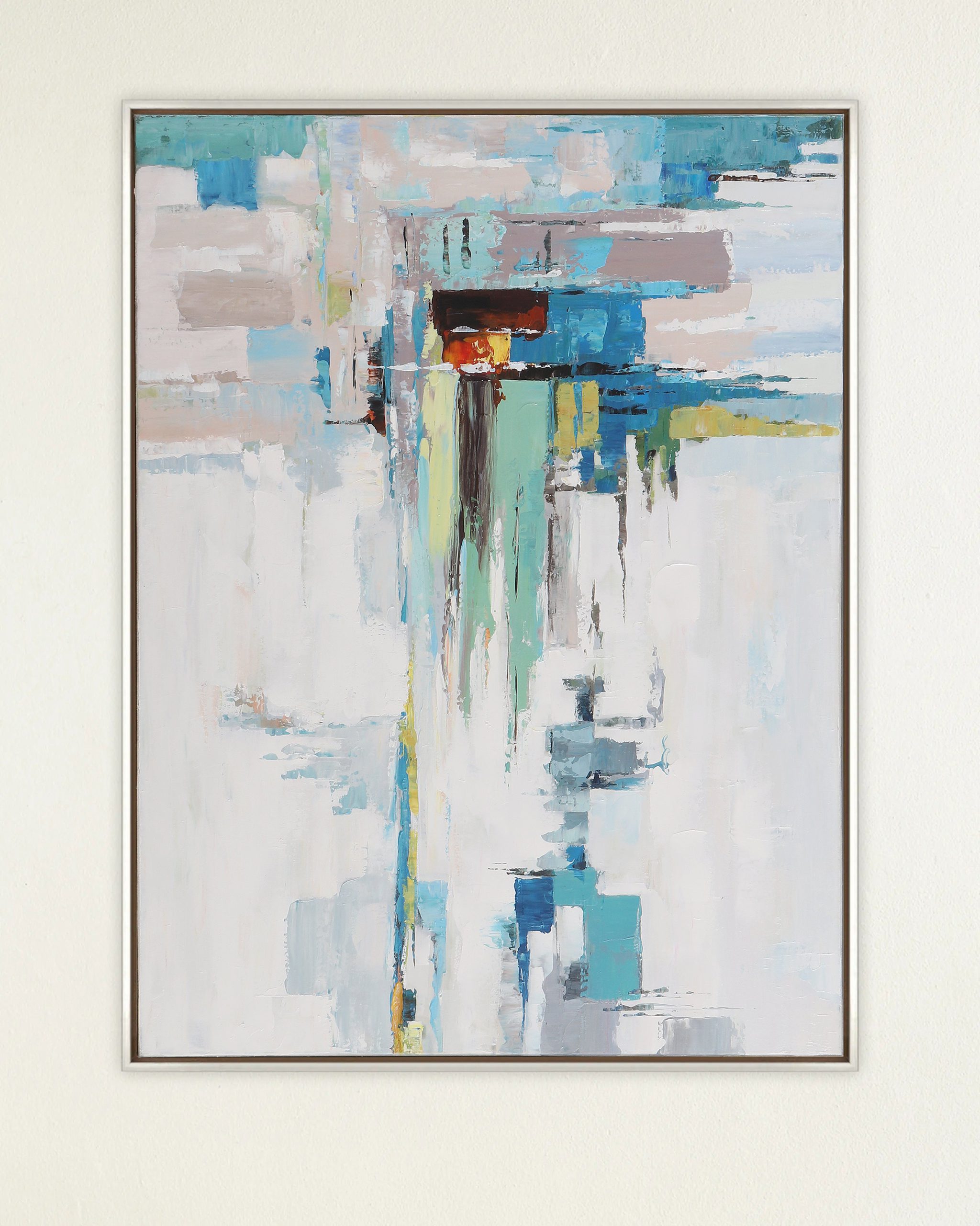 Картина сочетает в себе современные угловатые элементы с прохладной приглушенной цветовой палитрой. Мягкий лазурный, синий и нейтральные серые цвета на холсте подчеркивают его текстуру, картина обрамлена серебряной рамой. Можно разместить горизонтально или вертикально.