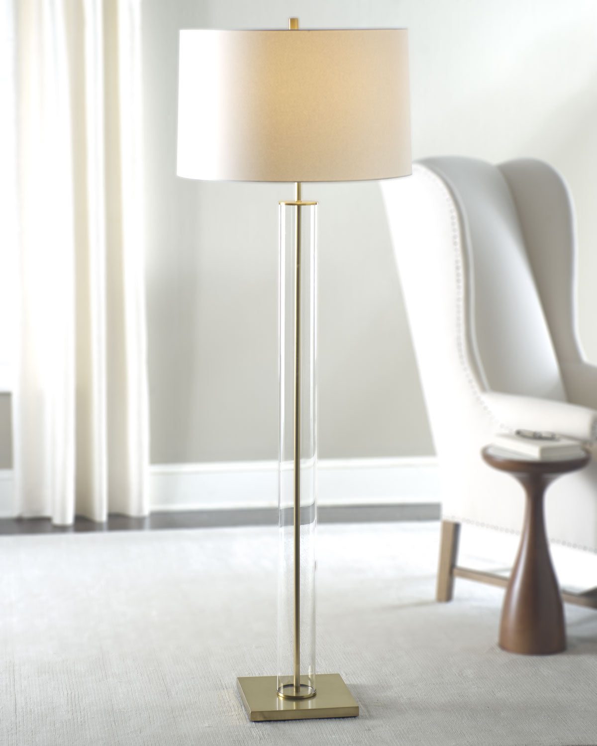 Торшер состоит из стеклянной колонны, который окружает стальной металлический стержень. Устойчивость конструкции придает квадратное основание из полированного металла в цвете латунь. Напольная лампа “Томас” придаст не только необходимое освещение любому пространству, но и добавит стиля.