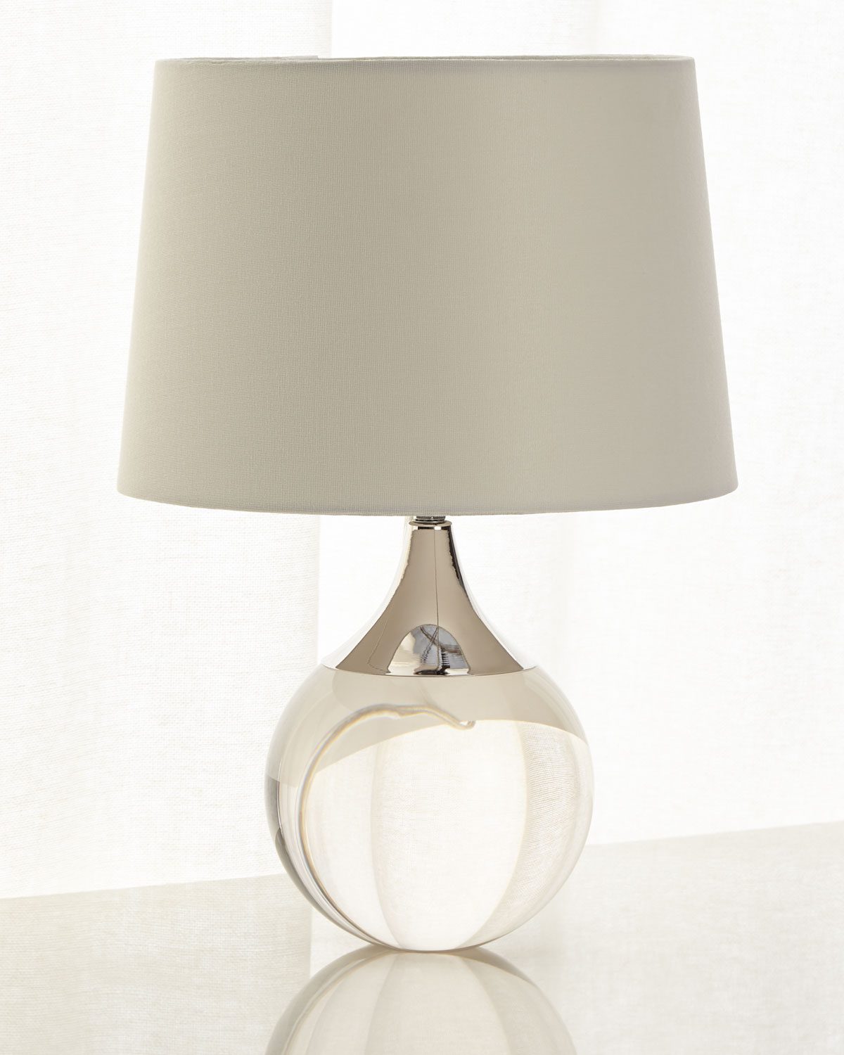 Настольная лампа “Милуоки” с металлическими элементами в гладком хромированном цвете и основанием в форме хрустального полированного шара и белым конусным льняным абажуром.