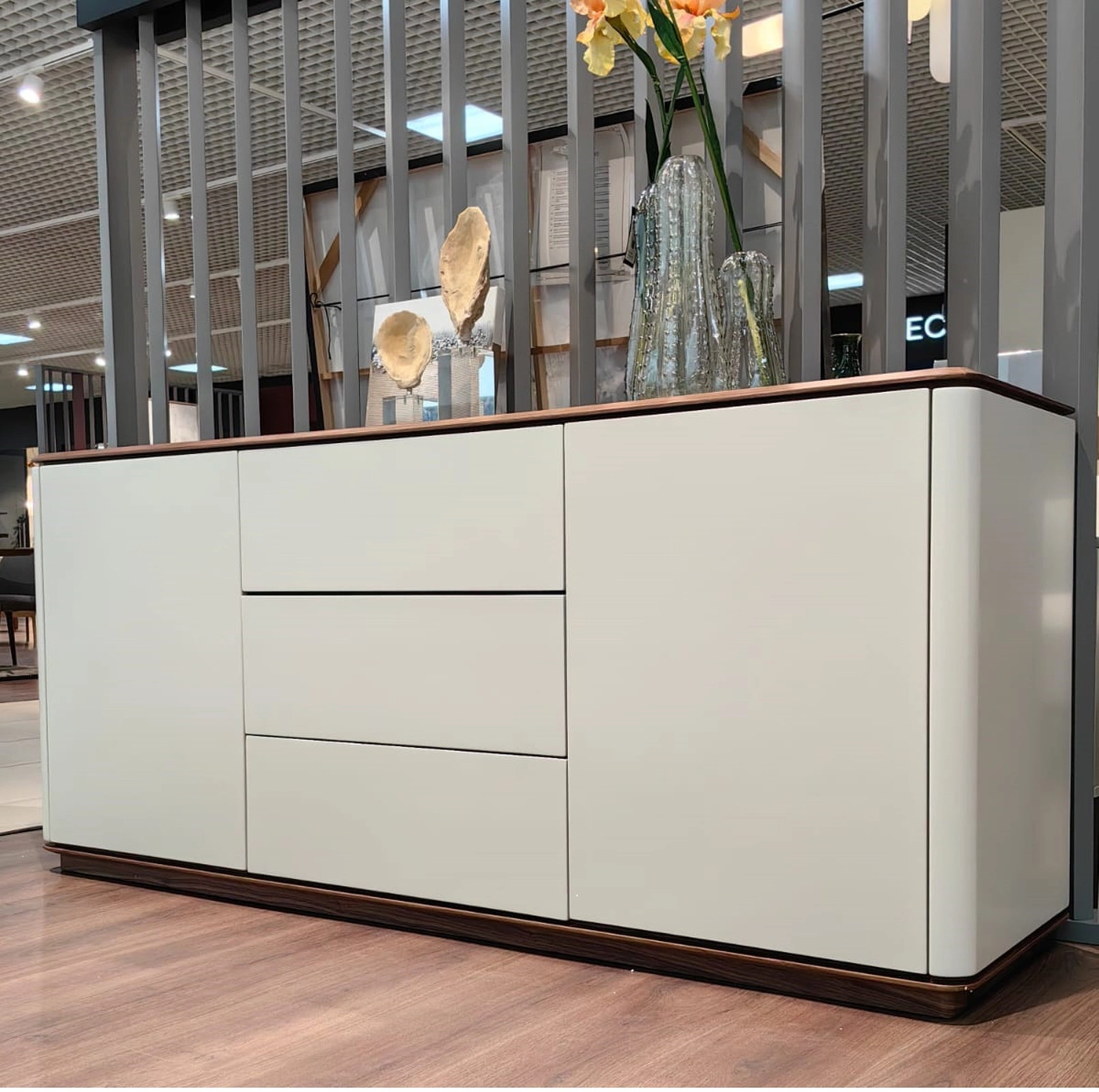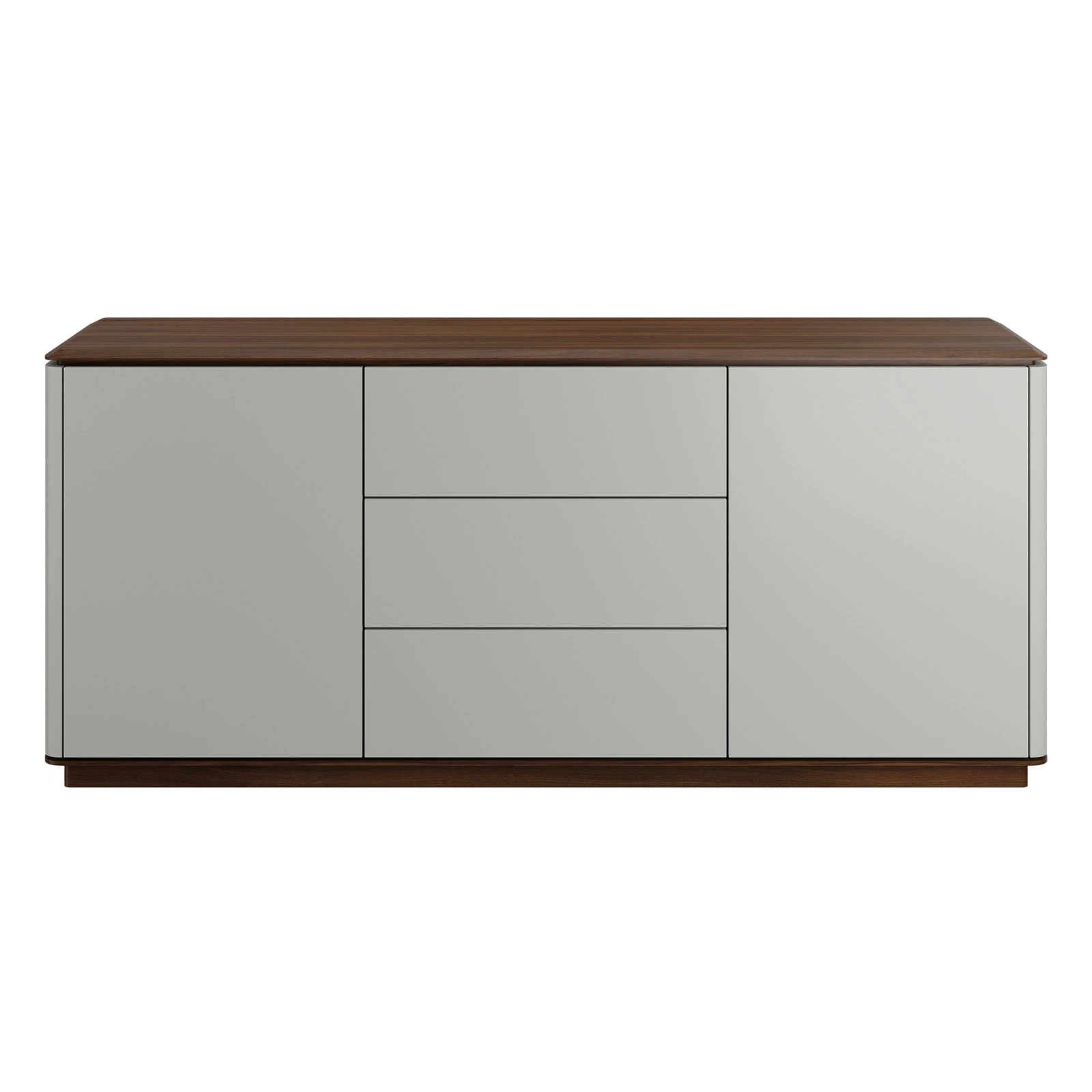 Буфет выполнен из высококачественного МДФ высокой прочности. Отделка корпуса и фасадов - матовый лак приятного светло-серого оттенка. Отделка столешницы и базы - натуральный шпон ореха.
