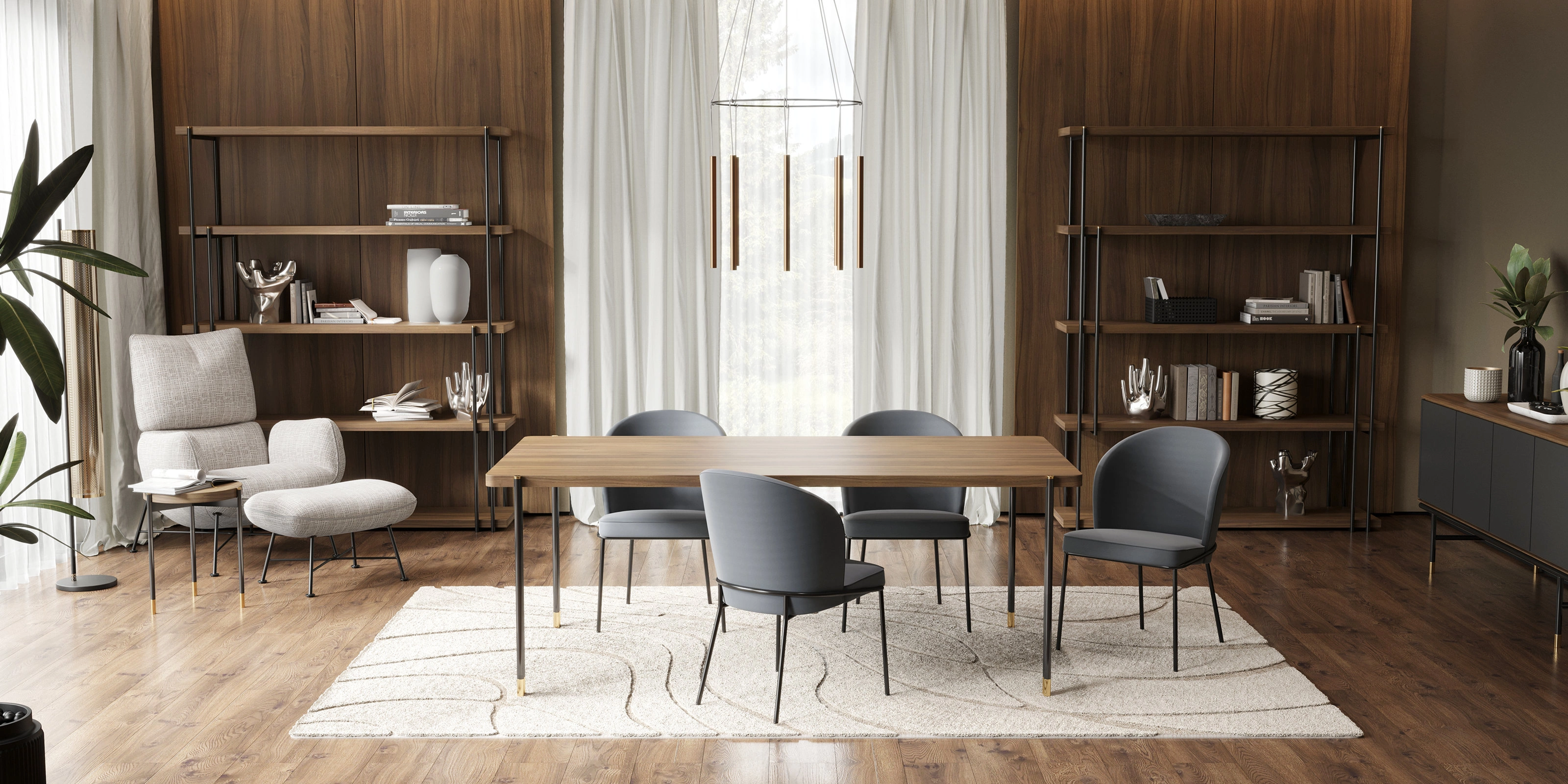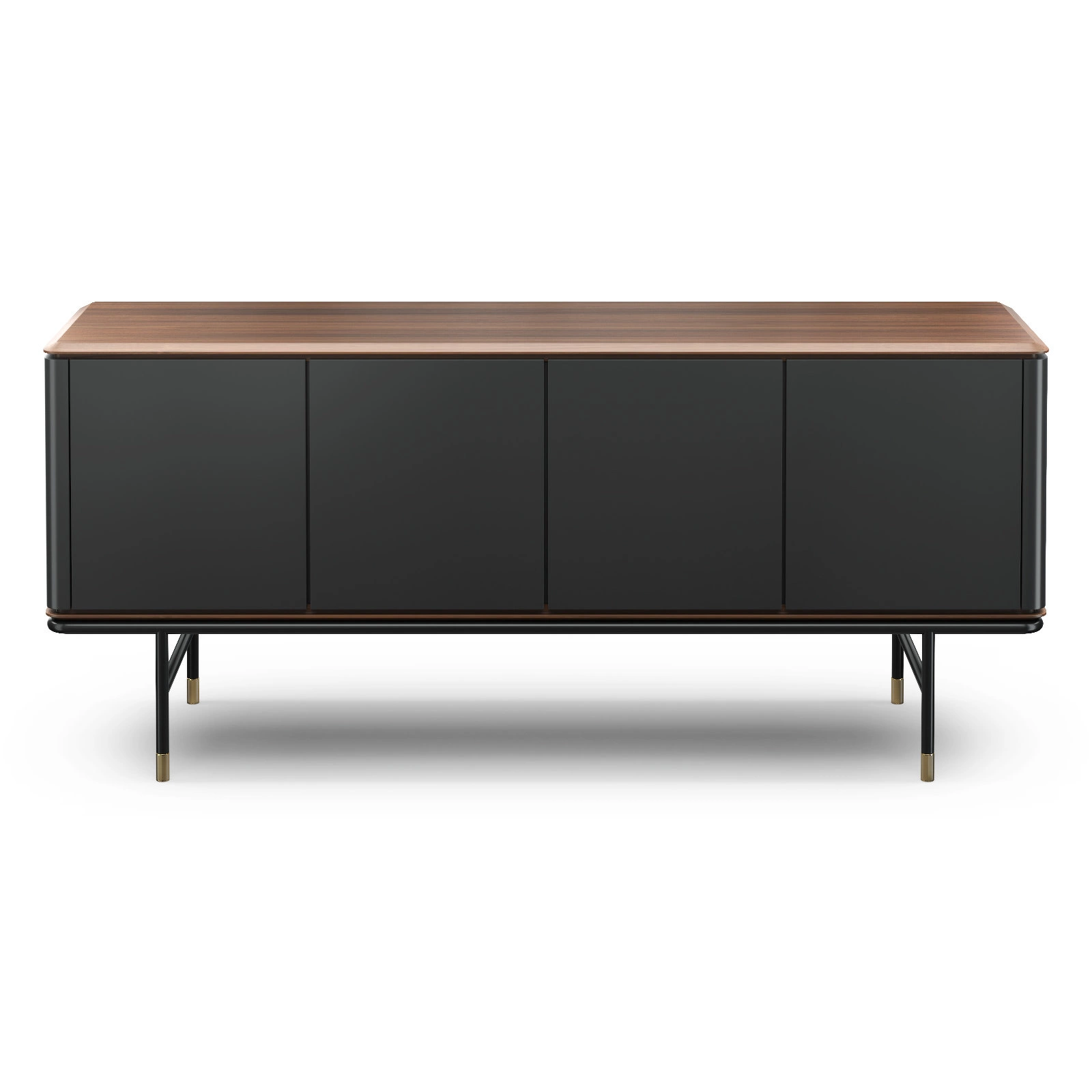 Силуэтный дизайн на высоких черных ножках с латунными колпачками идеален для создания лаконичного интерьера. Матовые фасады красиво рассеивают естественный и искусственный свет.