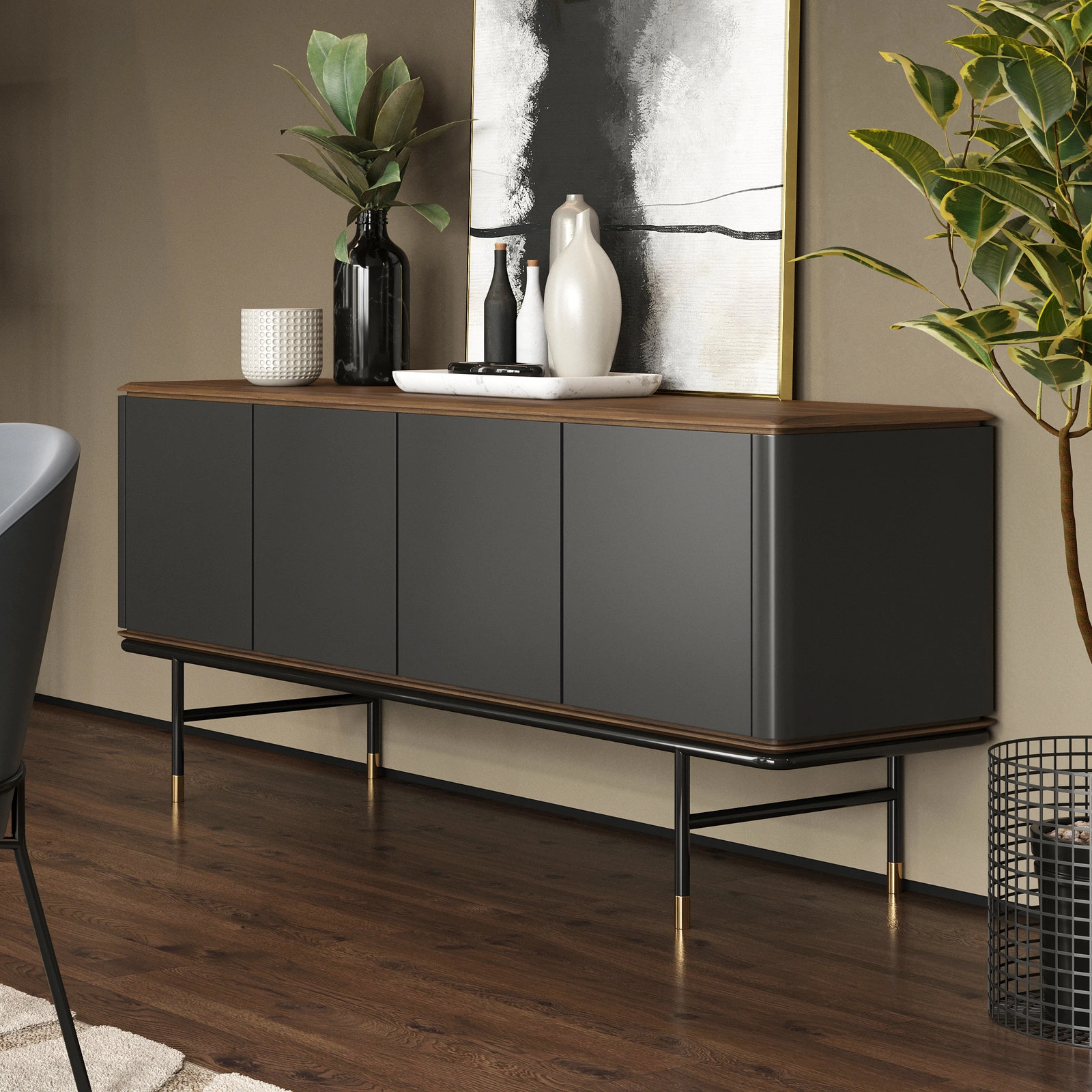 Столешница буфета выполнена в натуральном шпоне ореха и имеет скругленные углы, что предотвращает травмирование. Фасады в отделке благородным темно-серым матовым лаком.