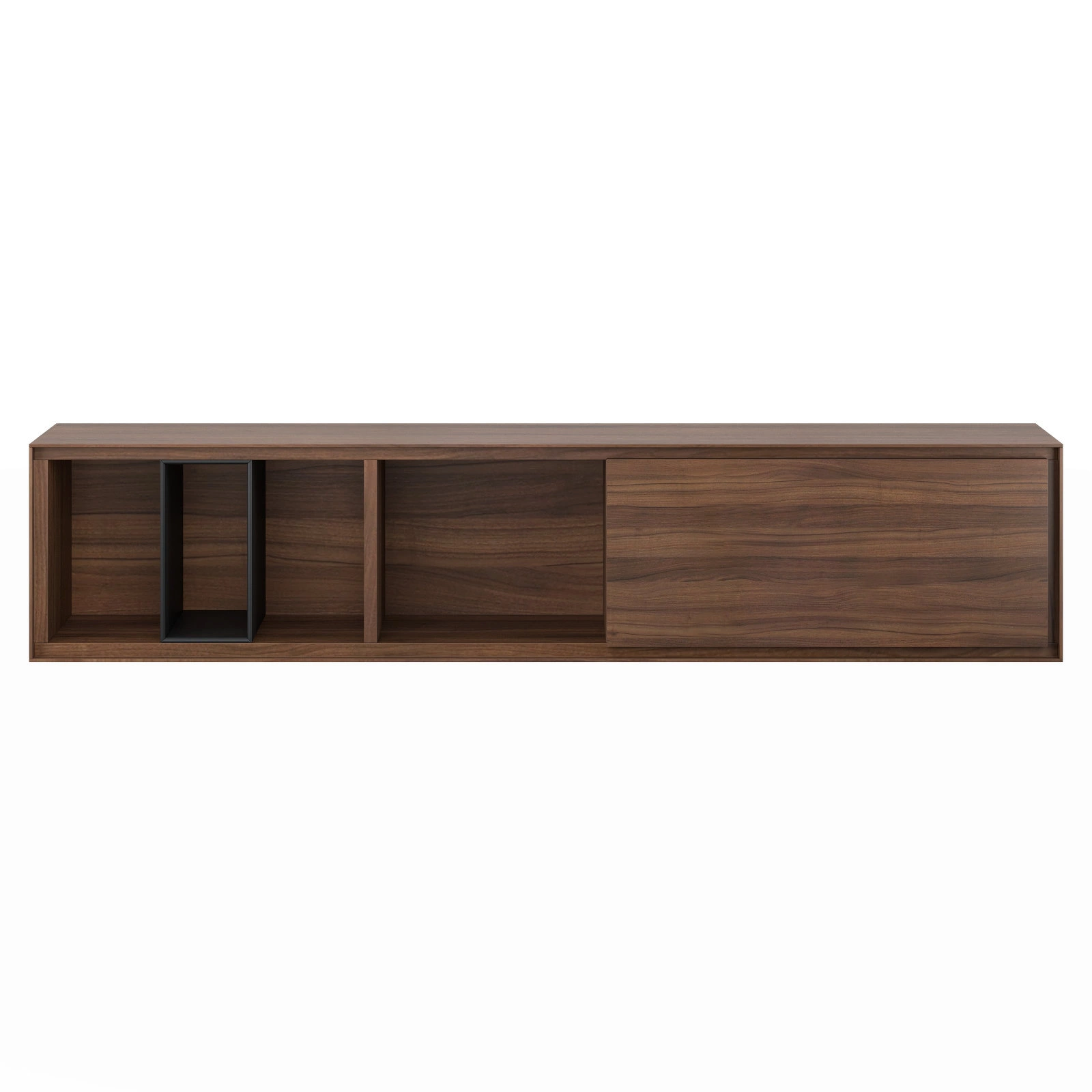 Подвесной модуль выполнен из высококачественного, сертифицированного МДФ высокой плотности. Отделка - натуральный шпон северо-американского ореха. Вставка-разделитель в открытой полке выполнена из метала и окрашена в черный матовый цвет.