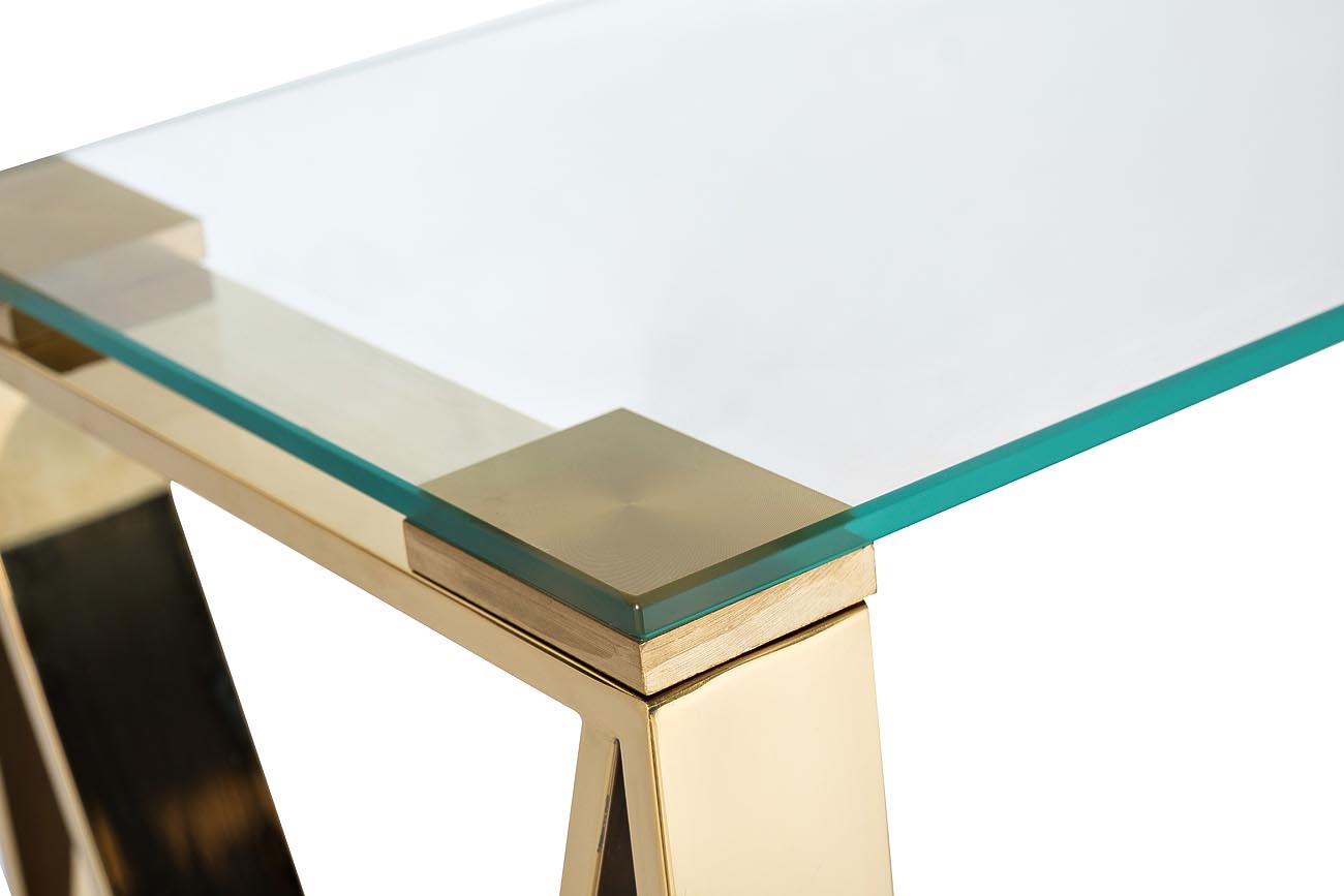 Изящная консоль из полированной стали золотого цвета со столешницей из прозрачного стекла специально создана для небольших помещений, в которые не так просто подобрать красивую стильную обстановку. Консоль шириной всего 30 см. прекрасно подойдет для прихожей, холла или коридора. Сумки и перчатки, вазы и статуэтки, каталоги и журналы будут выглядеть просто восхитительно на этой дизайнерской консоли. Дополните ваш интерьер зеркалами и светильниками в цвете золото, чтобы создать законченный ансамбль.