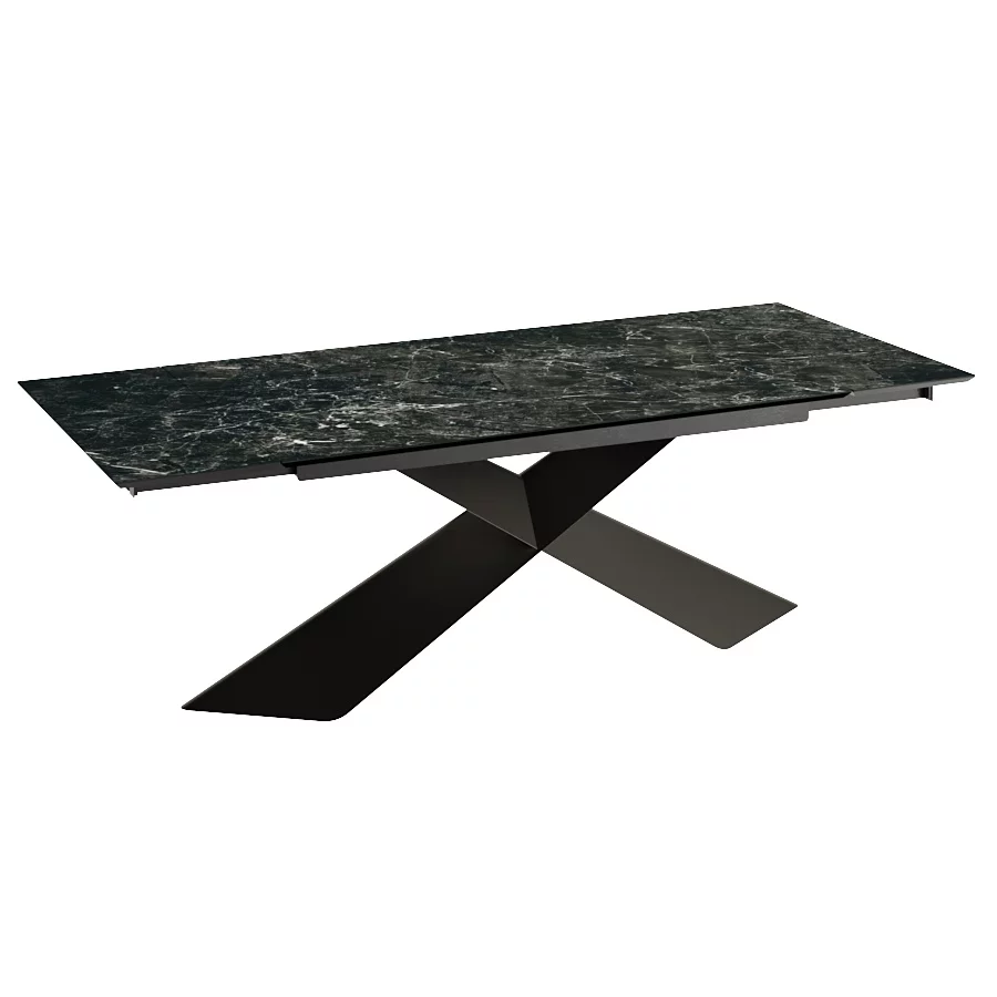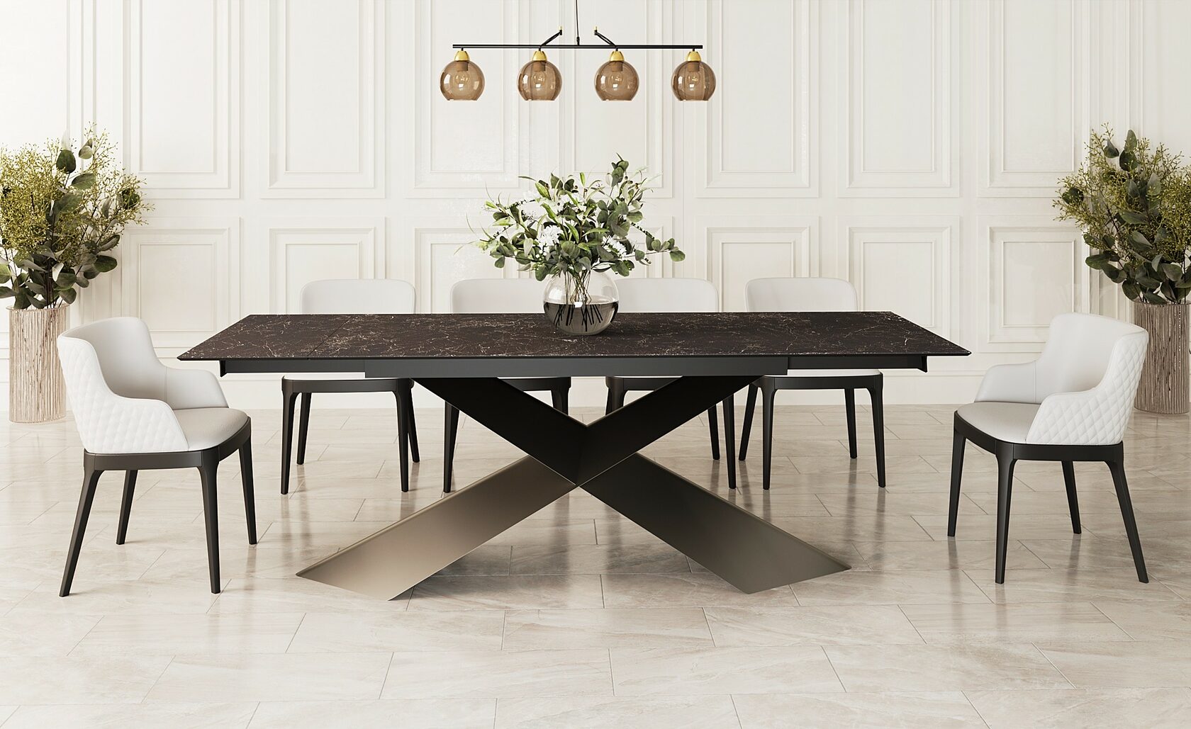 Стол Turon – роскошная модель в современном стиле, отличающаяся контрастным противопоставлением фактур и оттенков отделки. Массивное фигурное основание стола в виде скошенного креста изготовлено искусными мастерами из полированного профилированного металла. Тонкая, но прочная столешница прямоугольной формы, которая по желанию клиента может быть дополнена раздвижным механизмом. Стол может быть органично дополнен обеденными стульями из коллекции фабрики.