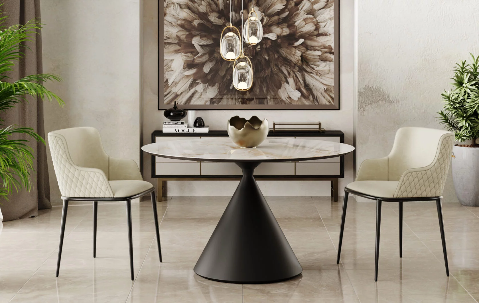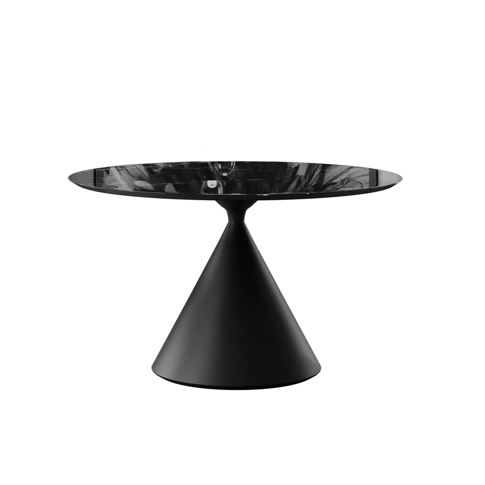 Обеденный стол SANTIAGO сделан из прочного и высококачественного материала. Он имеет столешницу круглой или овальной формы, которая не раскладывается. Опора стола выполнена в форме конуса и изготовлена из прочного металла. Цвет опоры - черный, что придает столу современный и стильный вид. Черный цвет добавляет элегантности и характера столу, при этом легко сочетается с различными интерьерными стилями. Стол SANTIAGO идеально подходит для создания уютной обеденной зоны в вашем доме или ресторане. Его дизайн и функциональность обеспечивают комфортное пространство для приема пищи и встреч с друзьями и семьей. Благодаря надежным материалам и качественной конструкции, этот стол будет служить вам долгое время и радовать вас своей эстетической привлекательностью.