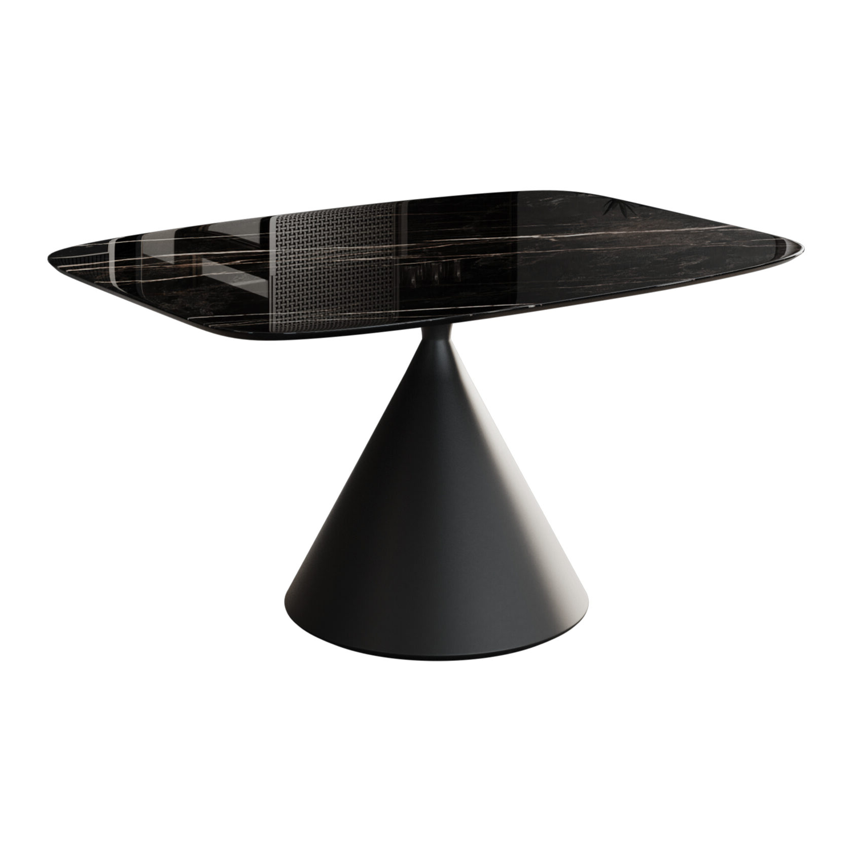 Обеденный стол SANTIAGO сделан из прочного и высококачественного материала. Он имеет столешницу круглой или овальной формы, которая не раскладывается. Опора стола выполнена в форме конуса и изготовлена из прочного металла. Цвет опоры - черный, что придает столу современный и стильный вид. Черный цвет добавляет элегантности и характера столу, при этом легко сочетается с различными интерьерными стилями. Стол SANTIAGO идеально подходит для создания уютной обеденной зоны в вашем доме или ресторане. Его дизайн и функциональность обеспечивают комфортное пространство для приема пищи и встреч с друзьями и семьей. Благодаря надежным материалам и качественной конструкции, этот стол будет служить вам долгое время и радовать вас своей эстетической привлекательностью.