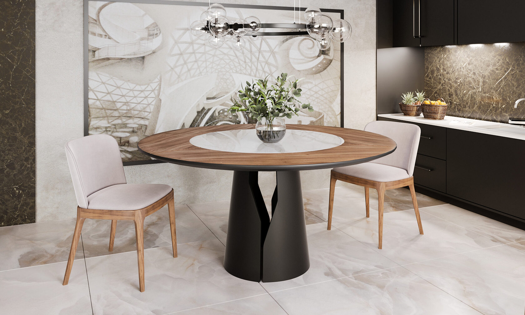 Стол на металлической опоре Giano спроектирован во множестве оттеночных вариаций. Линейку составляют изделия, имеющие круглую или прямоугольную столешницу. Она может быть изготовлена из керамики или шпона. Края керамических элементов обрабатываются вручную и приобретают матовую поверхность. Все представленные модификации объединяет конструкция опорного основания. Оно состоит из двух половин, пространство между которыми плавно расширяется кверху.