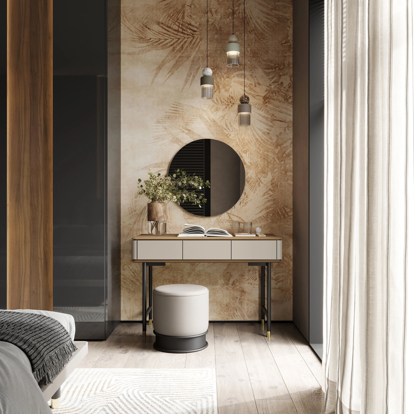 Миниатюрный дизайн на высоких черных ножках с латунными колпачками будет отлично смотреться в будуарной зоне. Матовые фасады красиво рассеивают свет.