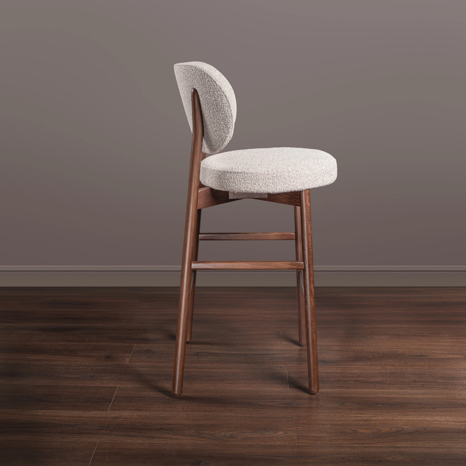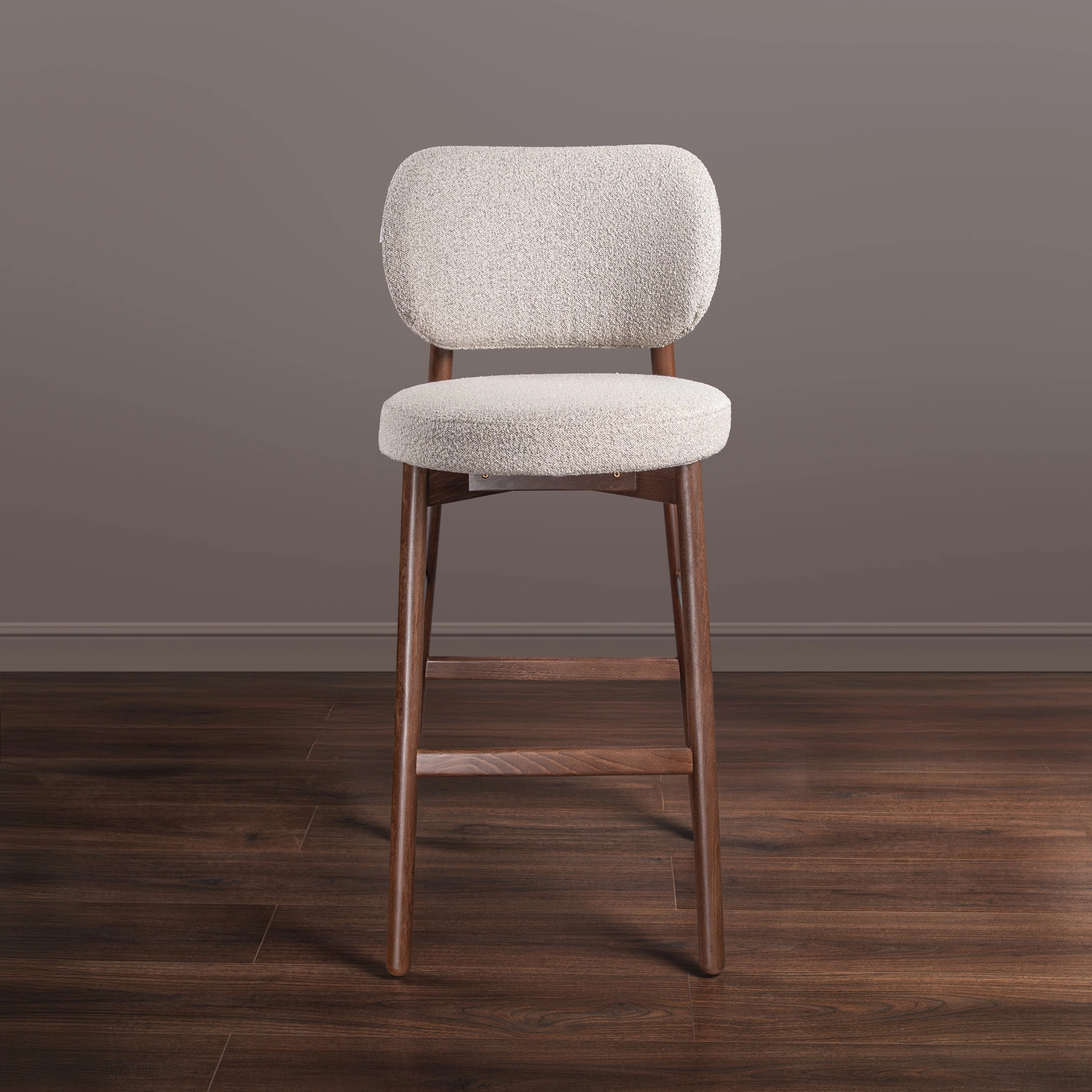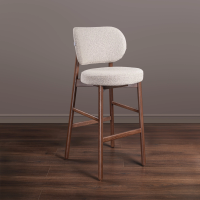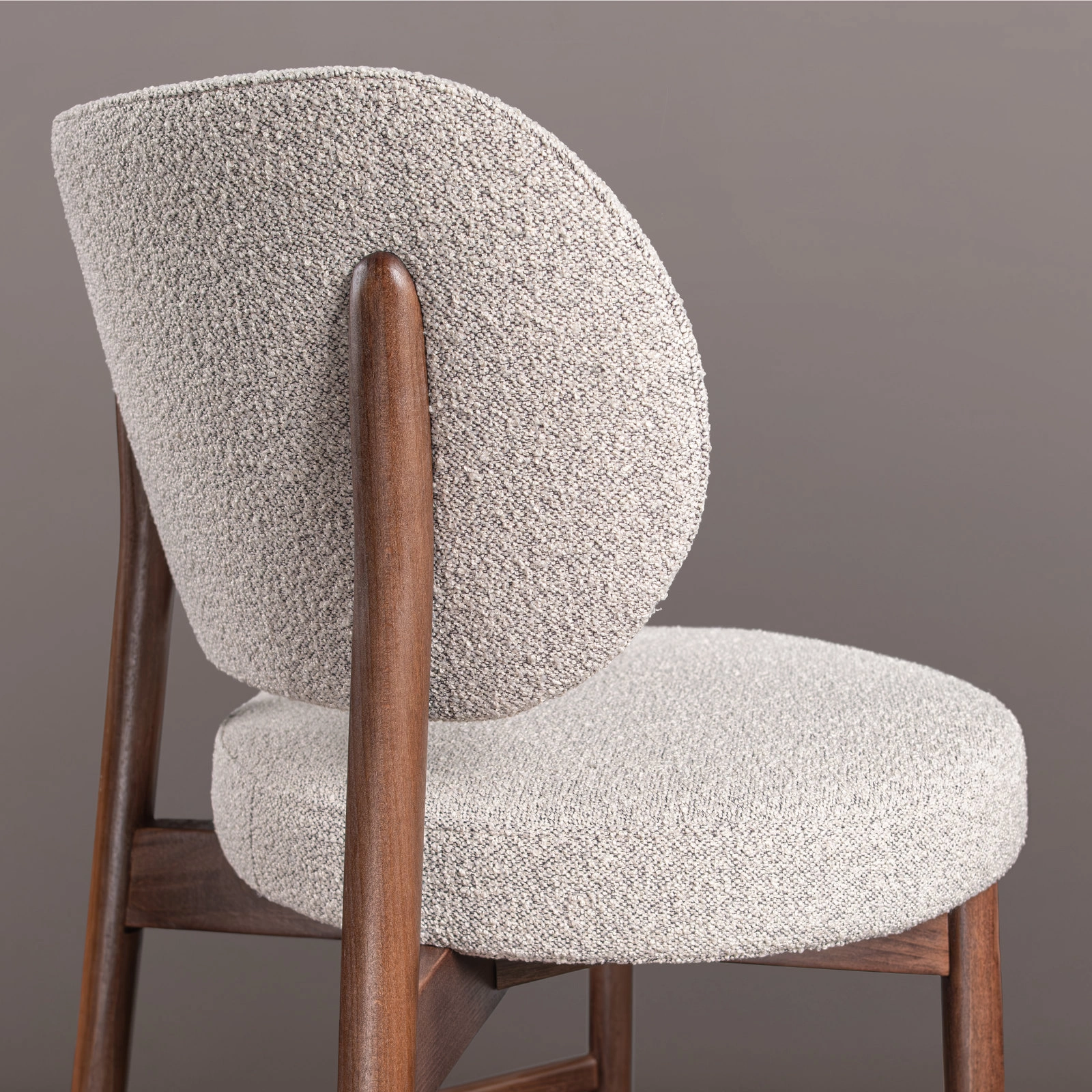 Каркас стула выполнен из МДФ и массива бука. Ножки стула из массива бука в цвете итальянский орех, обивка ткань букле в бежевых оттенках.
