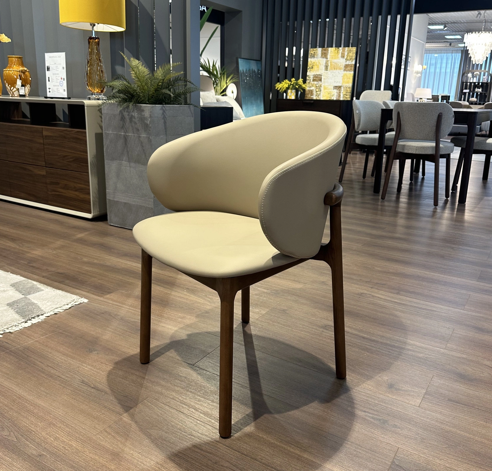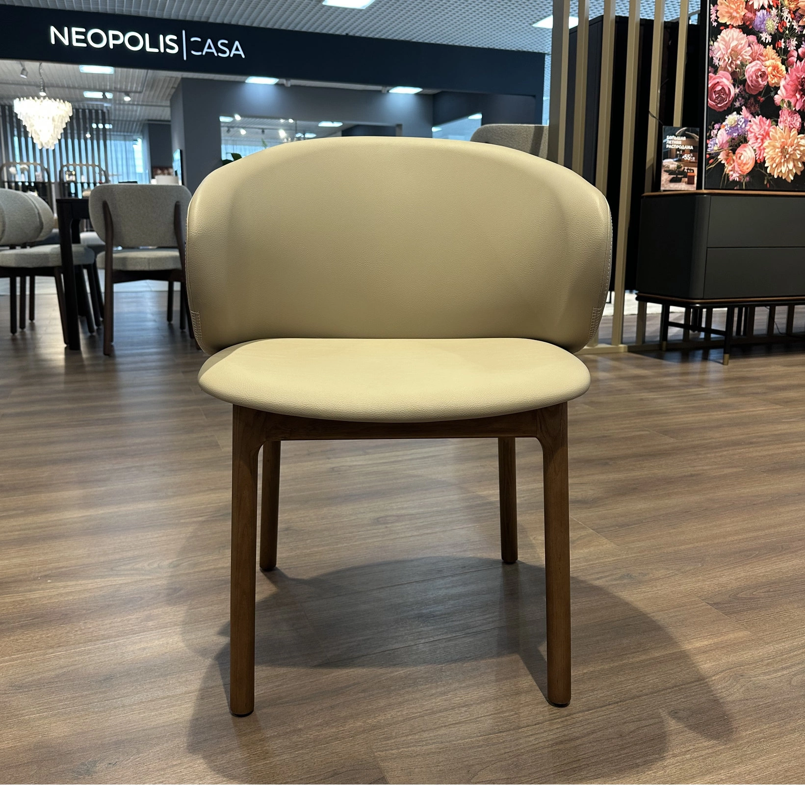 Каркас стула выполнен из массива ясеня, тонированного в цвет орех. Спинка и сиденье изготовлены из многослойной фанеры. Стул обит эко-кожей в бежевых тонах. Наполнитель спинки и сидения - пенополиуретан высокой плотности.