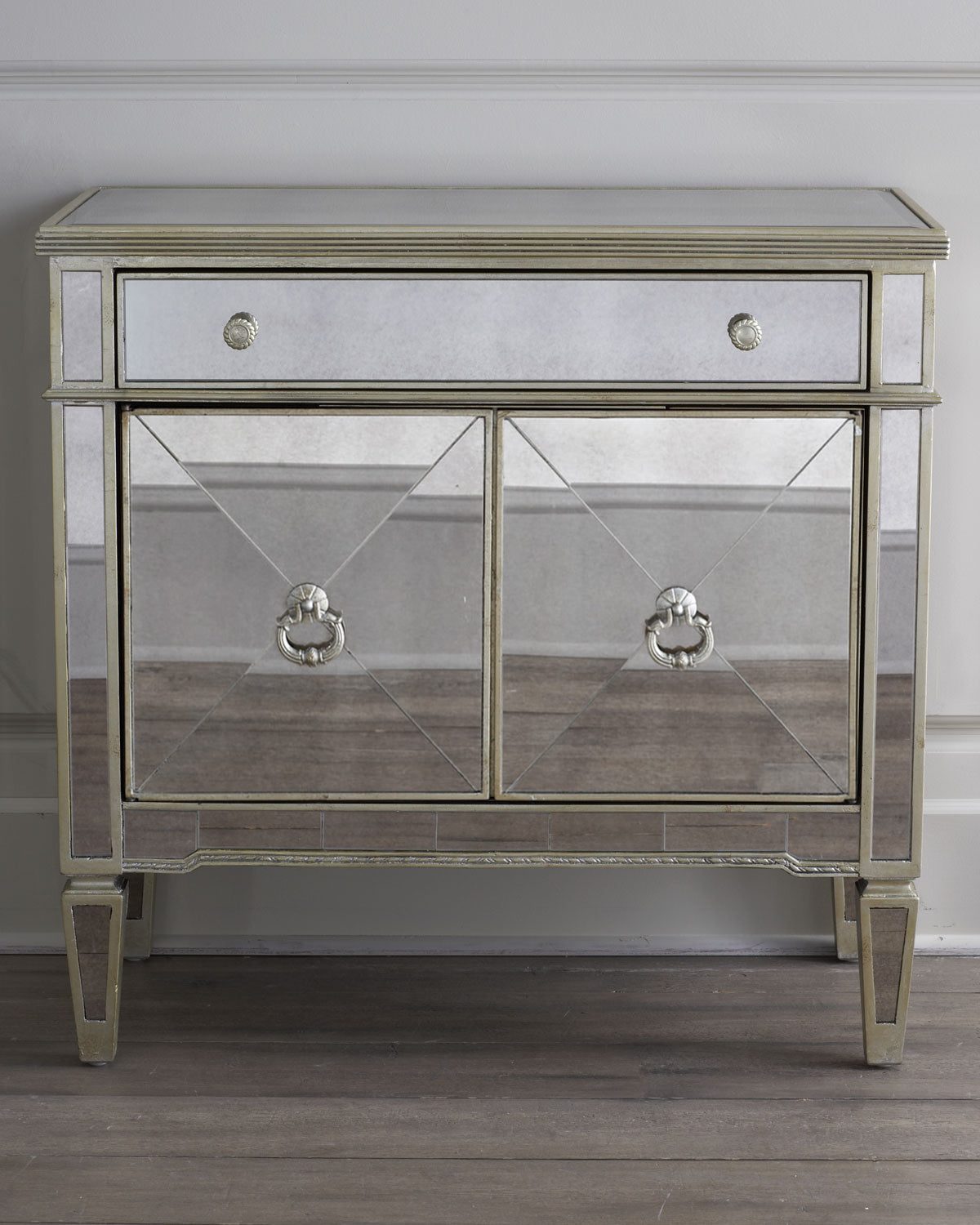 Зеркальный комод “Сарасота”, выполнен в состаренном стиле в цвете серебро, имеет две секции для хранения вещей, выдвижное отделение сверху для хранения мелочей, и вместительный ящик, который скрыт за зеркальными распашными дверцами. Компактные габариты и простота формы позволяют изделию одинаково гармонично вписываться в совершенно разные пространства.