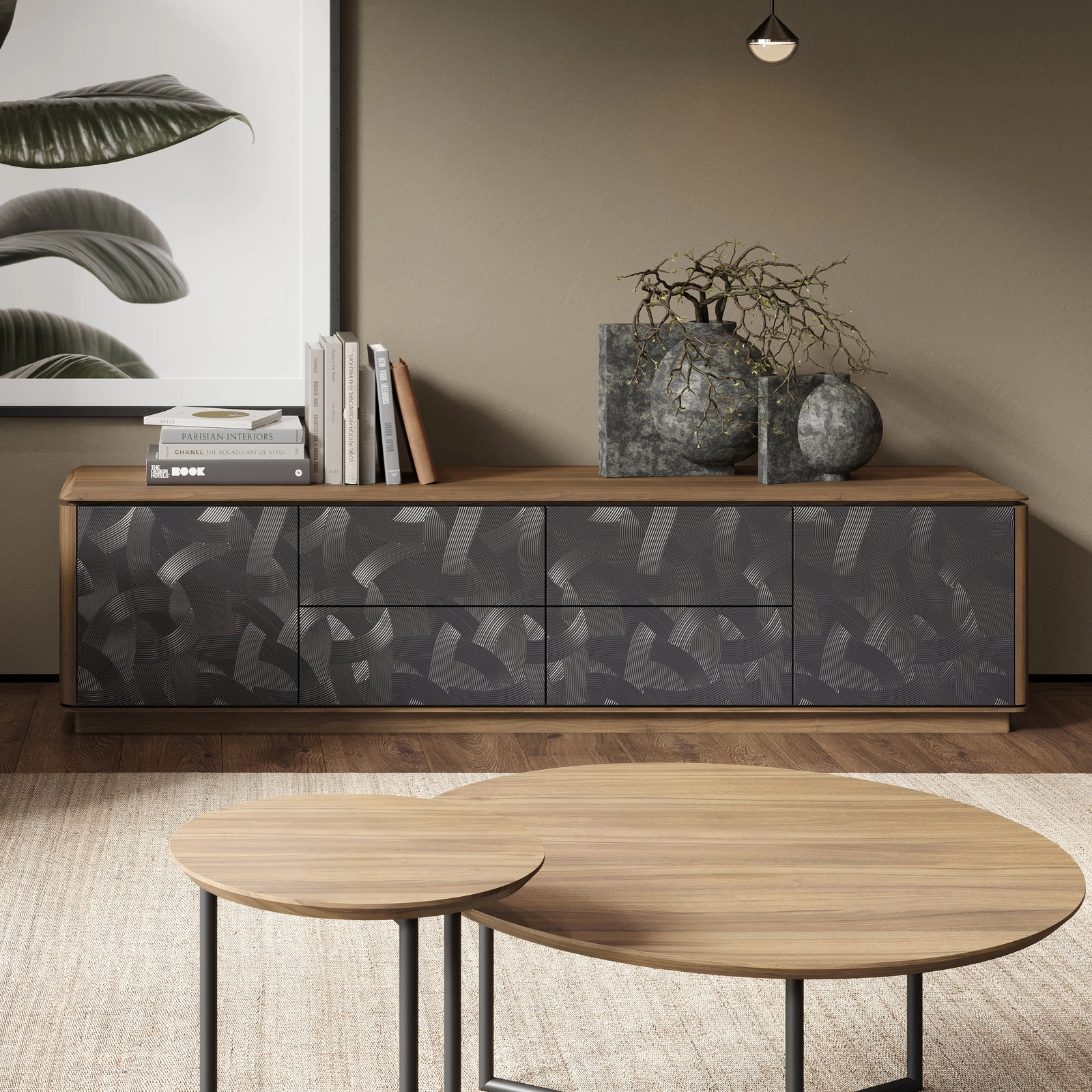 Дизайн восхищает эксклюзивным узором на черных фасадах мебели, выполненным методом тиснения. У тумбы есть четыре ящика и две дверцы, за которыми находятся еще по две полки в каждой секции.