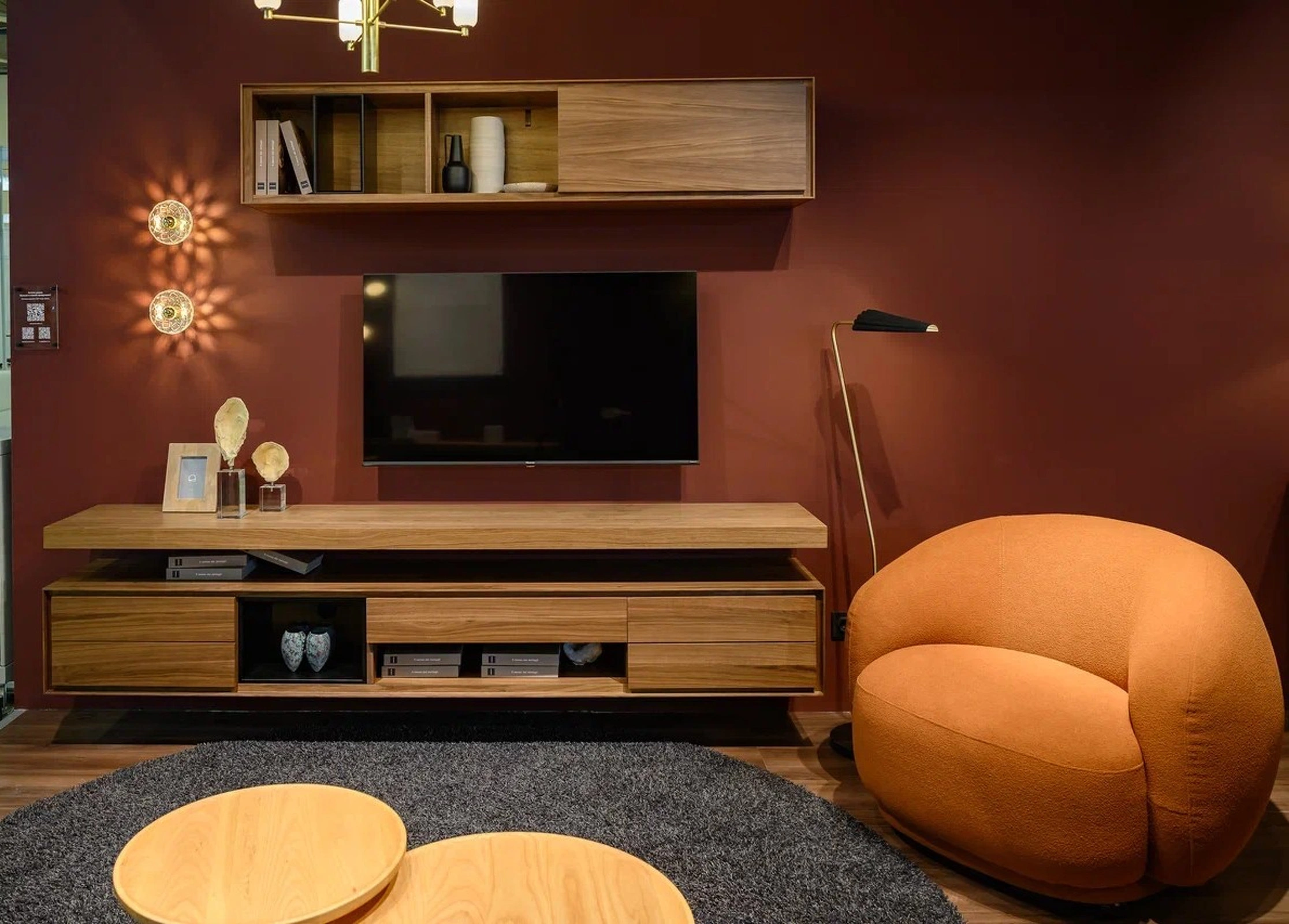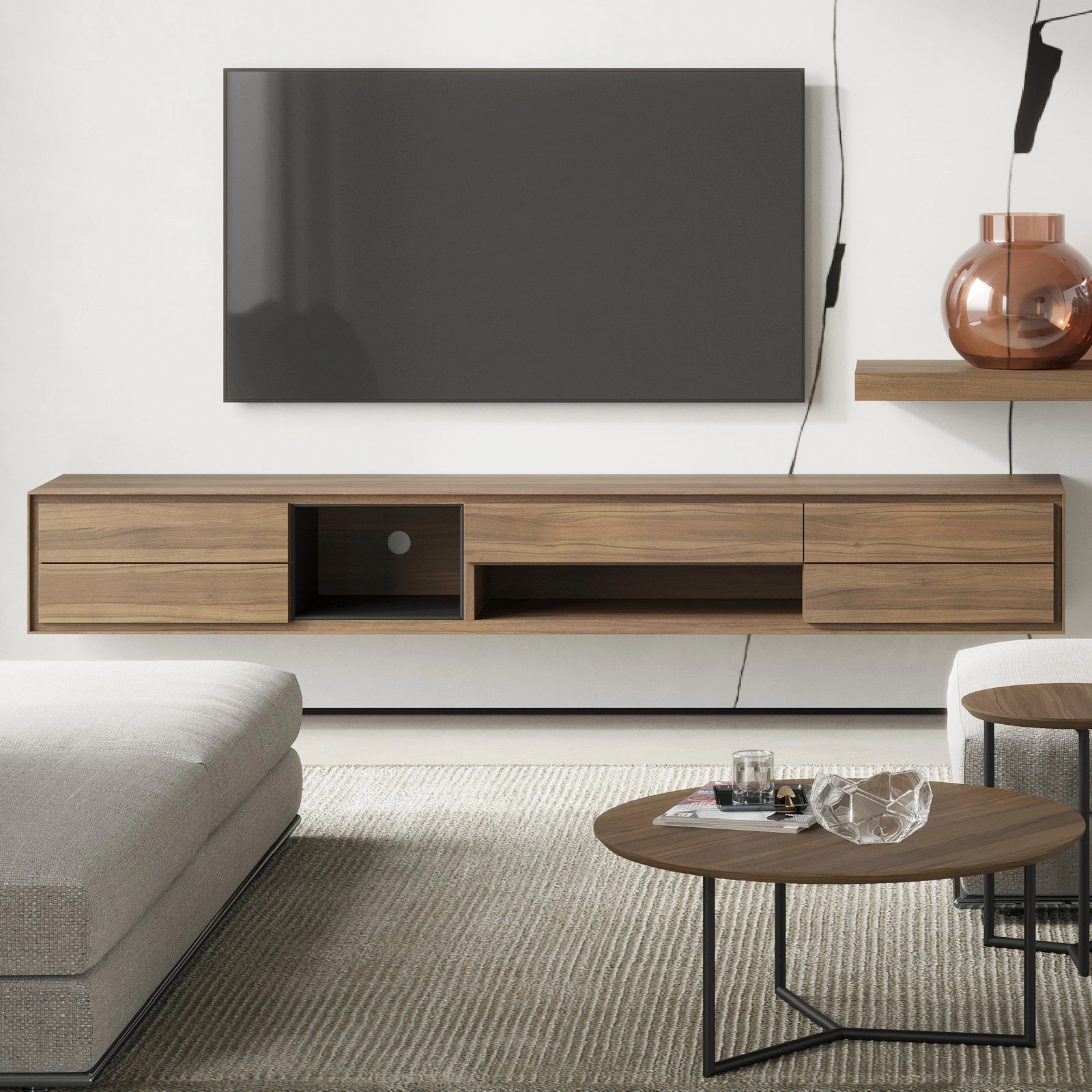 Подвесная ТВ тумба Miramar в современном стиле. Рисунок натурального шпона всегда индивидуален, что делает эту модель неповторимой. На фасадах сделан ручной подбор рисунка шпона, что значительно повышает уровень продукта.
