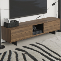 ТВ тумба выполнена из высококачественного, сертифицированного МДФ высокой плотности. Отделка - натуральный шпон северо-американского ореха. Ножки и вставка в открытой полке выполнены из метала и окрашены в черный матовый цвет.